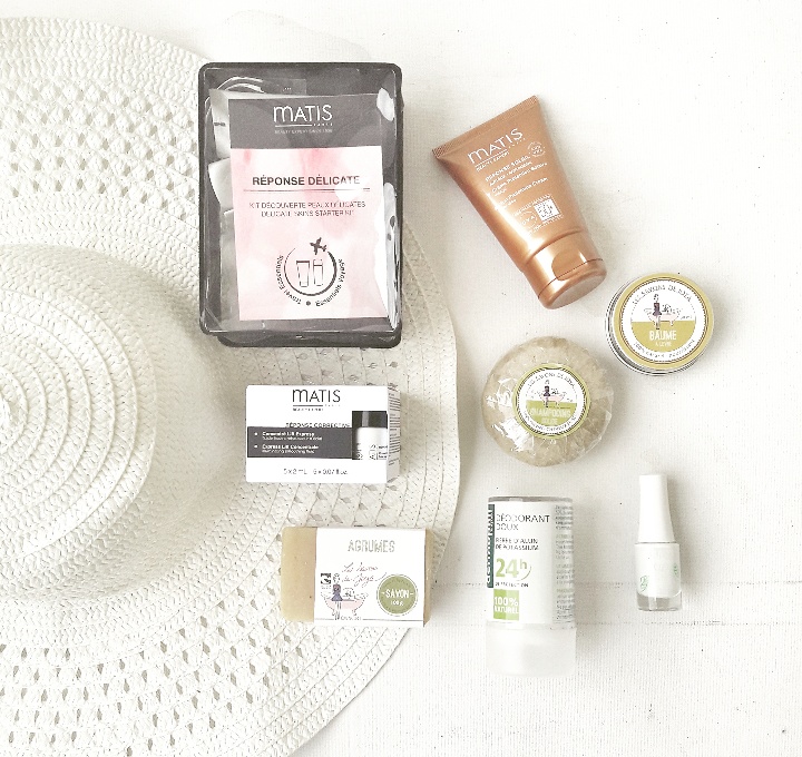 Mi-Août et certaines de mes copines sont rentrées bronzées et reposées et d’autres préparent leur valise pour terminer le mois en beauté. Je vous ai concocté une mini trousse beauté des essentielles à emporter avec soi, tout y est – une routine beauté visage Matis. Le Kit Voyage Réponse Délicate (crème démaquillante, lotion tilleul, crème de gommage, masque délicat, soin douceur hydratant), une crème Protection Solaire visage SPF 50, en 50 ml , toujours chez Matis et une boite de 4 flacons “Concentré Lift Express”. Un déodorant à la pierre d’alun Dermophil. Un vernis « coton » de la collection Good Nature par Innoxa. Et enfin cerise sur le gâteau, une sélection de la marque Les Savons de Joya: un shampoing solide et un baume lèvres et un savon au agrumes. C’est une marque de produits cosmétiques naturelles j’y consacre mon billet suivant tellement les produits sont topissime !