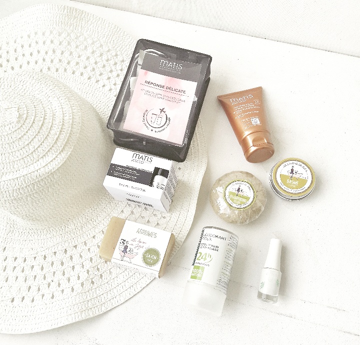 Mi-Août et certaines de mes copines sont rentrées bronzées et reposées et d’autres préparent leur valise pour terminer le mois en beauté. Je vous ai concocté une mini trousse beauté des essentielles à emporter avec soi, tout y est – une routine beauté visage Matis. Le Kit Voyage Réponse Délicate (crème démaquillante, lotion tilleul, crème de gommage, masque délicat, soin douceur hydratant), une crème Protection Solaire visage SPF 50, en 50 ml , toujours chez Matis et une boite de 4 flacons “Concentré Lift Express”. Un déodorant à la pierre d’alun Dermophil. Un vernis « coton » de la collection Good Nature par Innoxa. Et enfin cerise sur le gâteau, une sélection de la marque Les Savons de Joya: un shampoing solide et un baume lèvres et un savon au agrumes. C’est une marque de produits cosmétiques naturelles j’y consacre mon billet suivant tellement les produits sont topissime !
